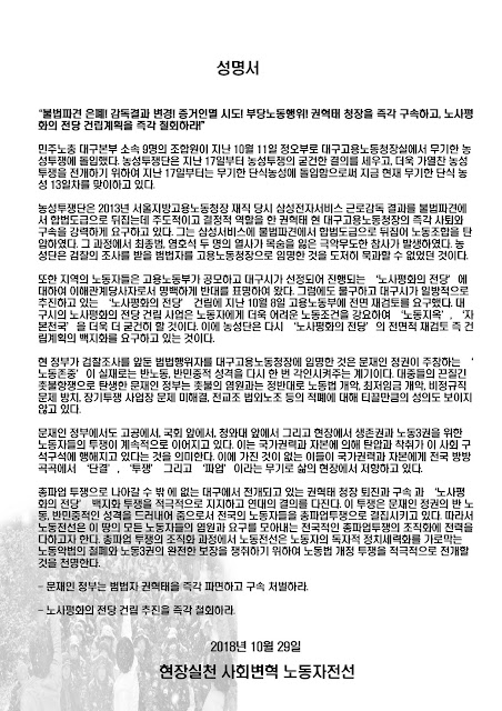 ÃÑÆÄ¾÷ ÅõÀïÀ¸·Î ³ª¾Æ°¥ ¼ö ¹Û ¿¡ ¾ø´Â ´ë±¸¿¡¼ Àü°³µÇ°í ÀÖ´Â ±ÇÇõÅ ûÀå ÅðÁø°ú ±¸¼Ó °ú ¡®³ë»çÆòÈÀÇ Àü´ç¡¯ ¹éÁöÈ ÅõÀïÀ» Àû±ØÀûÀ¸·Î ÁöÁöÇÏ°í ¿¬´ëÀÇ °áÀǸ¦ ´ÙÁø´Ù. ÀÌ ÅõÀïÀº ¹®ÀçÀÎ Á¤±ÇÀÇ ¹Ý ³ëµ¿, ¹Ý¹ÎÁßÀûÀÎ ¼º°ÝÀ» µå·¯³»¾î ÁÜÀ¸·Î¼ Àü±¹ÀÇ ³ëµ¿ÀÚµéÀ» ÃÑÆÄ¾÷ÅõÀïÀ¸·Î °áÁý½Ã۰í ÀÖ´Ù. µû¶ó¼ ³ëµ¿Àü¼±Àº ÀÌ ¶¥ÀÇ ¸ðµç ³ëµ¿ÀÚµéÀÇ ¿°¿ø°ú ¿ä±¸¸¦ ¸ð¾Æ³»´Â Àü±¹ÀûÀÎ ÃÑÆÄ¾÷ÅõÀïÀÇ Á¶Á÷È¿¡ Àü·ÂÀ» ´ÙÇϰíÀÚ ÇÑ´Ù. ÃÑÆÄ¾÷ ÅõÀïÀÇ Á¶Á÷È °úÁ¤¿¡¼ ³ëµ¿Àü¼±Àº ³ëµ¿ÀÚÀÇ µ¶ÀÚÀû Á¤Ä¡¼¼·Âȸ¦ °¡·Î¸·´Â ³ëµ¿¾Ç¹ýÀÇ Ã¶Æó¿Í ³ëµ¿3±ÇÀÇ ¿ÏÀüÇÑ º¸ÀåÀ» ÀïÃëÇϱâ À§ÇÏ¿© ³ëµ¿¹ý °³Á¤ ÅõÀïÀ» Àû±ØÀûÀ¸·Î Àü°³ÇÒ °ÍÀ» õ¸íÇÑ´Ù.